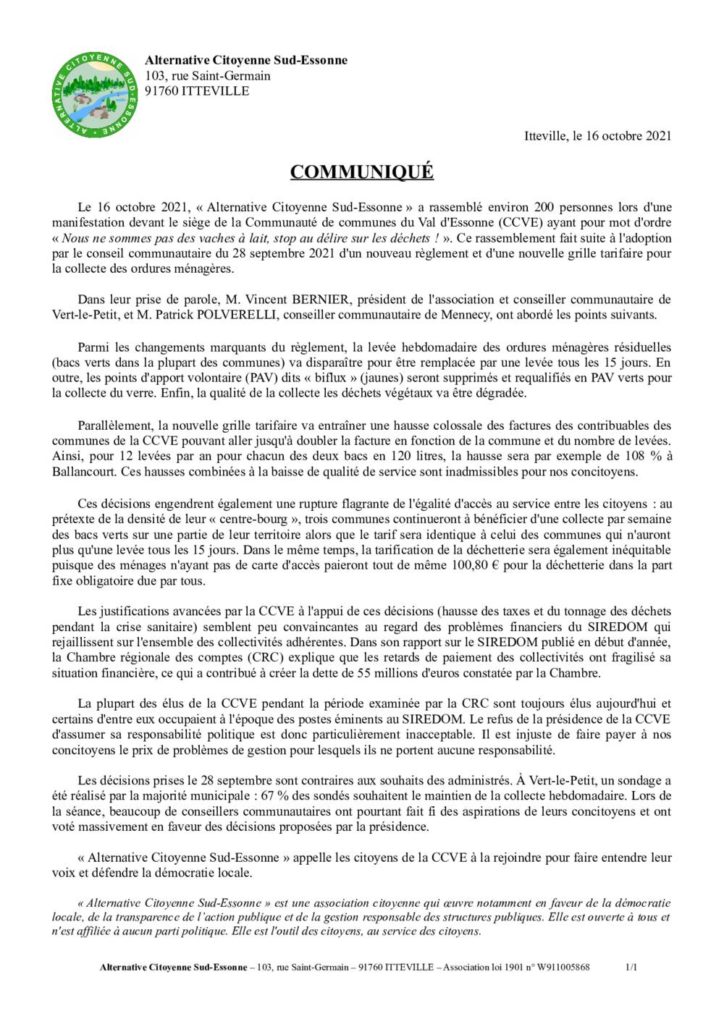 Suite à la manifestation organisée le samedi 24 septembre devant le siège de la CCVE, nous avons vu un « droit de réponse » de la part de Patrick Imbert, président de la CCVE où entre autres, il est question des vertus de la nouvelle organisation des collectes et en particulier de l’économie générée par la réduction du nombre de passages pour la collecte des OMR (les poubelles vertes).